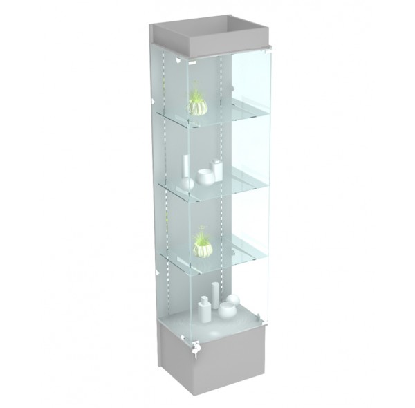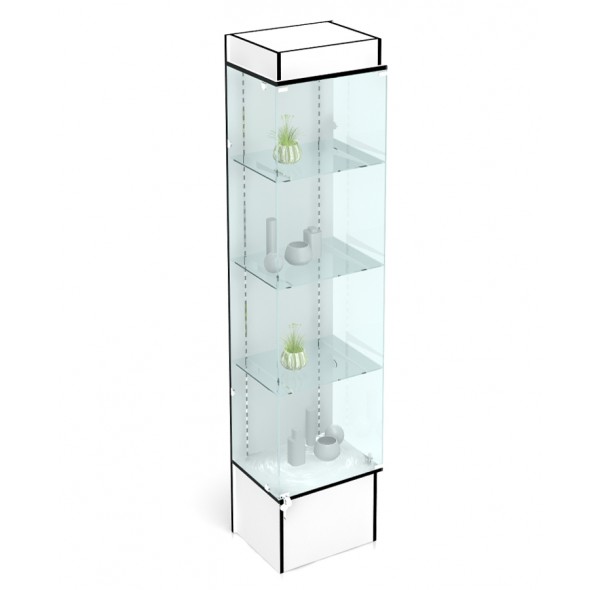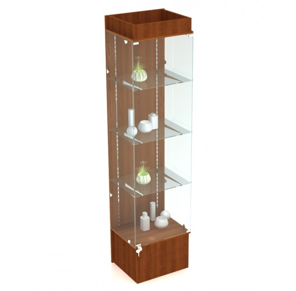 Изготовлена из ЛДСП 16 мм, кромка ПВХ 2 мм, стёкла толщиной 5 мм, обработка - шлифовка. Высота подиума - 300 мм "от пола". Витрина имеет 4 полки - 3 стеклянных, 1 - ДСП. Стеклянные полки устанавливаются на специальные кронштейны, за счёт них расстояние между полками варьируется. Стеклянный фасад (дверца) закрывается на замок. Так же имеется подсветка. Боковые стёкла крепятся при помощи металлических стеклодержателей, задняя стенка витрины - ДСП.