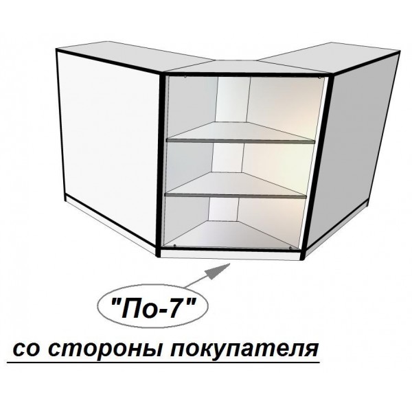 Прилавок угловой со стеклом. Прилавок "глухой". Изготовлен из ЛДСП 16 мм, кромка ПВХ 2 мм. Боковины углового прилавка - 400 мм, но занимаемая площадь (при виде сверху) - 540х540 мм. Со стороны продавца - прилавок частично открыт (+/- 200 мм), имеет 3 полки ДСП. Со стороны покупателя стекло - толщиной 5мм, крепится при помощи хромированных держателей с винтовыми зажимами, обработка - шлифовка. Угловой внешний прилавок По-7 разворачивает линию прилавков на 90 градусов, - тем самым - образуя "наружный" угол, а также может являться завершающим элементом.